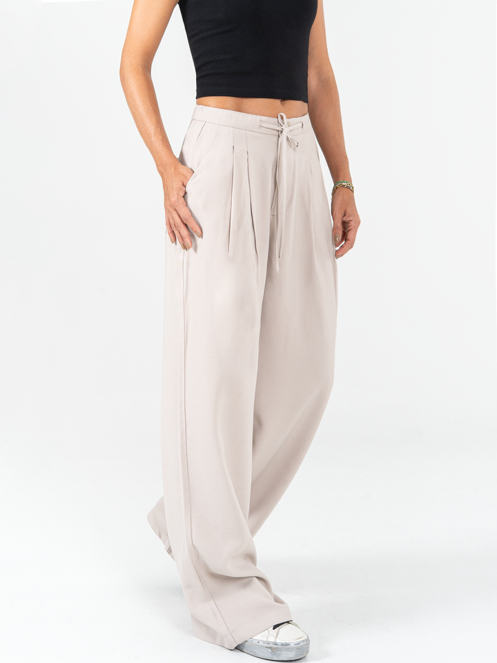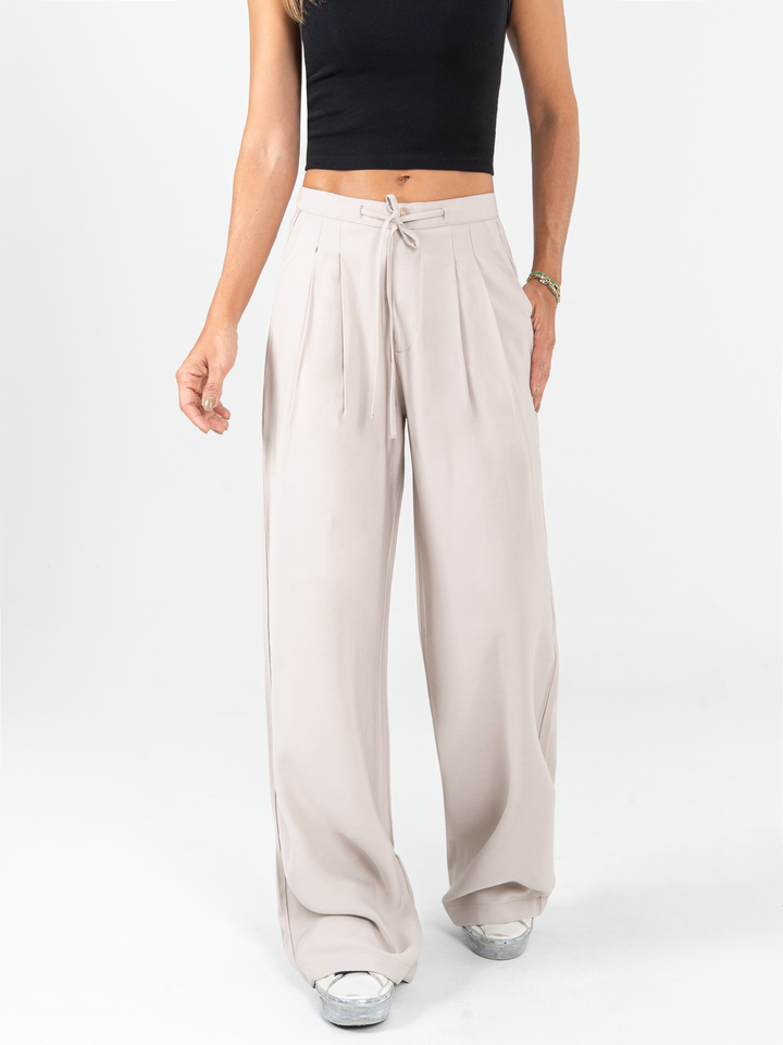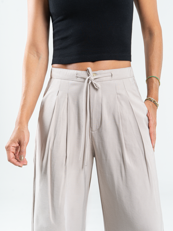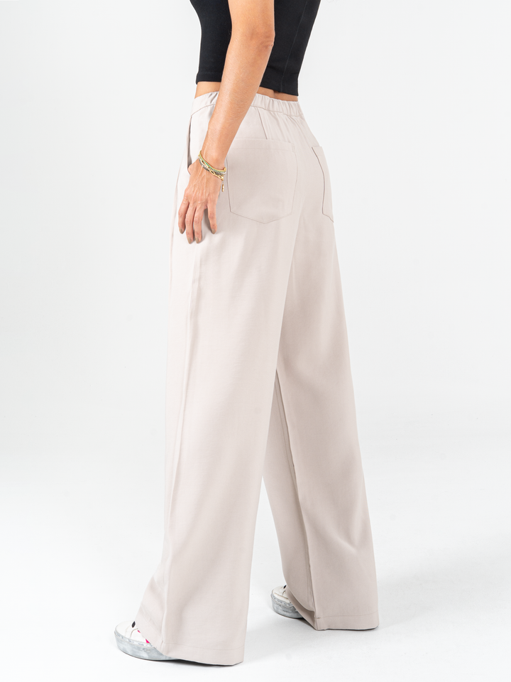 Pantalón mom flare tejido liviano, pretina resortada, prenses, tono arena, tiro alto, bolsillo diagonal.