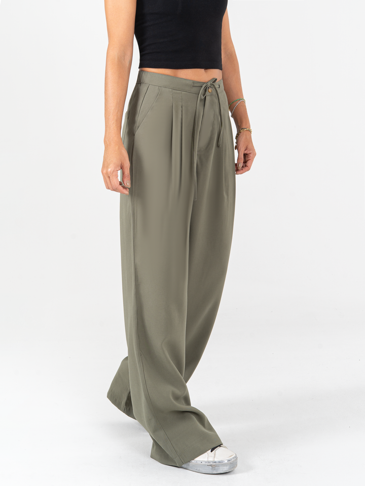 Pantalón mom flare tejido liviano, pretina resortada, prenses, tono verde, tiro alto, bolsillo diagonal.