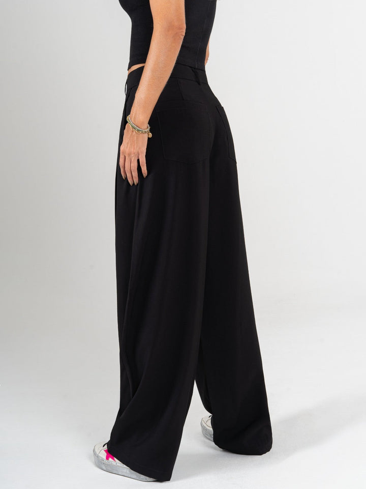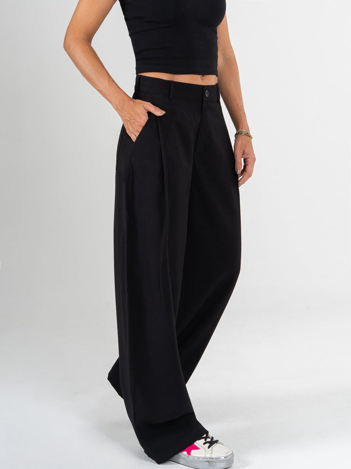 Pantalón wide leg, tejido plano liviano, tiro alto, con prenses, tono negro, bolsillo diagonal, silueta amplia