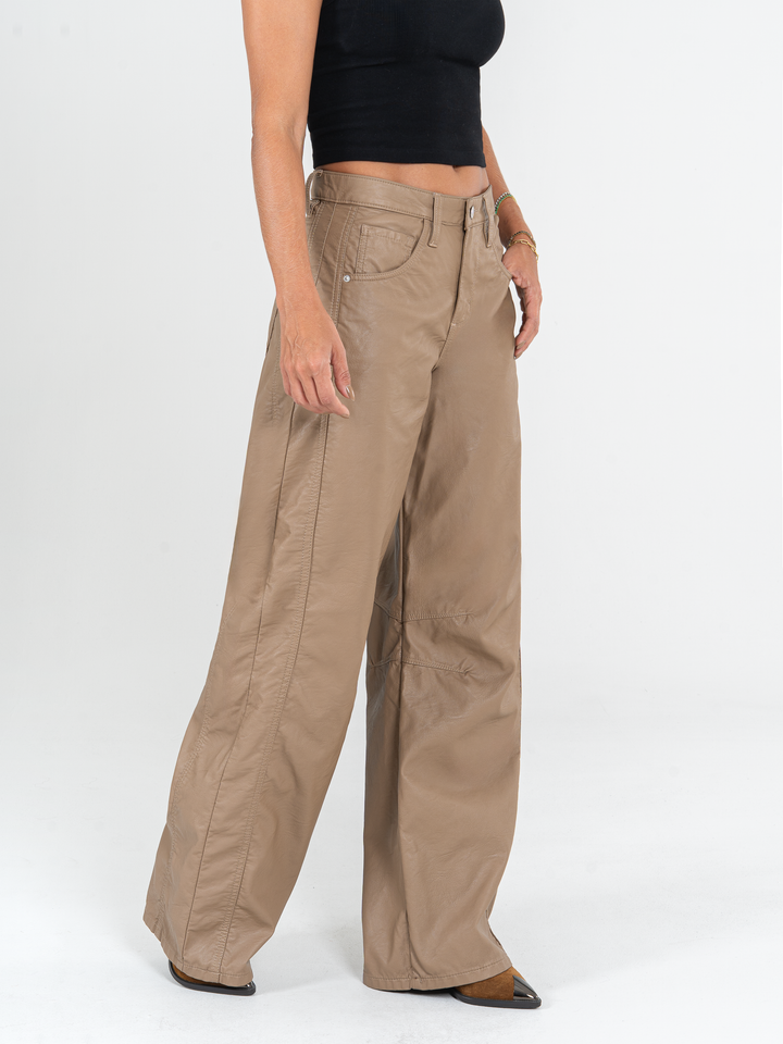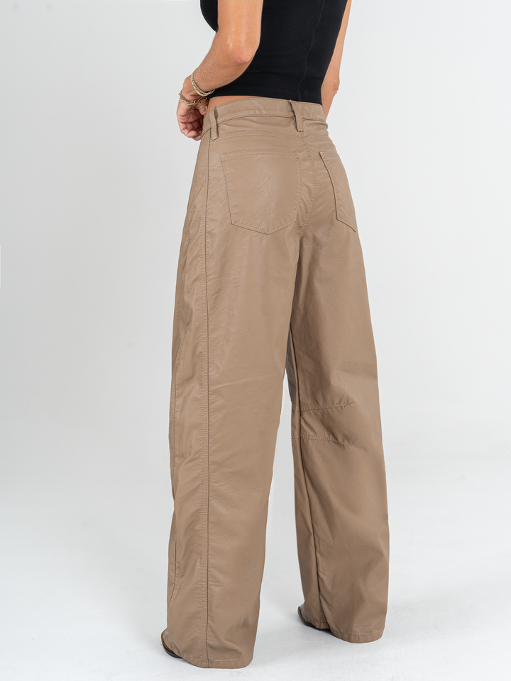 Ref: 0620129 Pantalón wide leg, rígido, tiro alto, cortes en costado, efecto cuero, tono camel