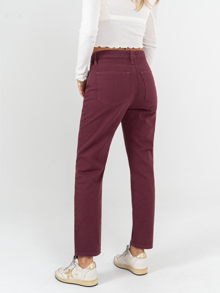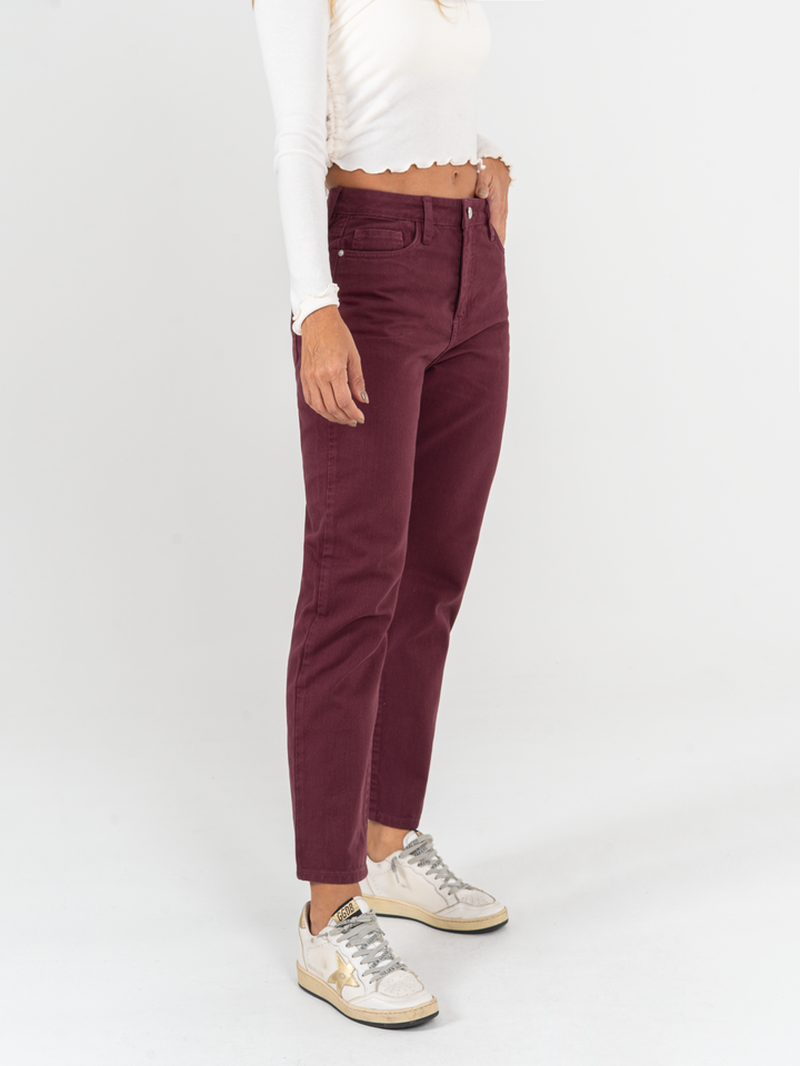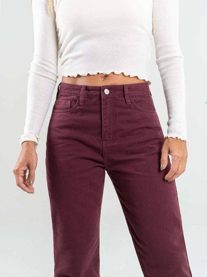 Pantalón mom fit, rígido, tiro alto, tono vino tinto, cintura ajustada, pierna holgada, diseño cinco bolsillos.