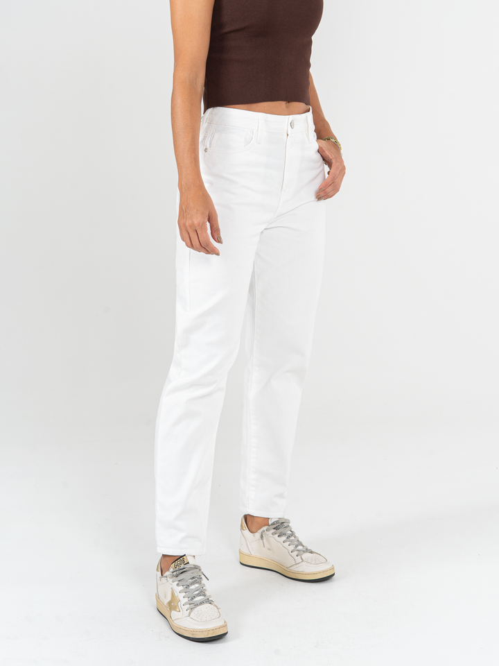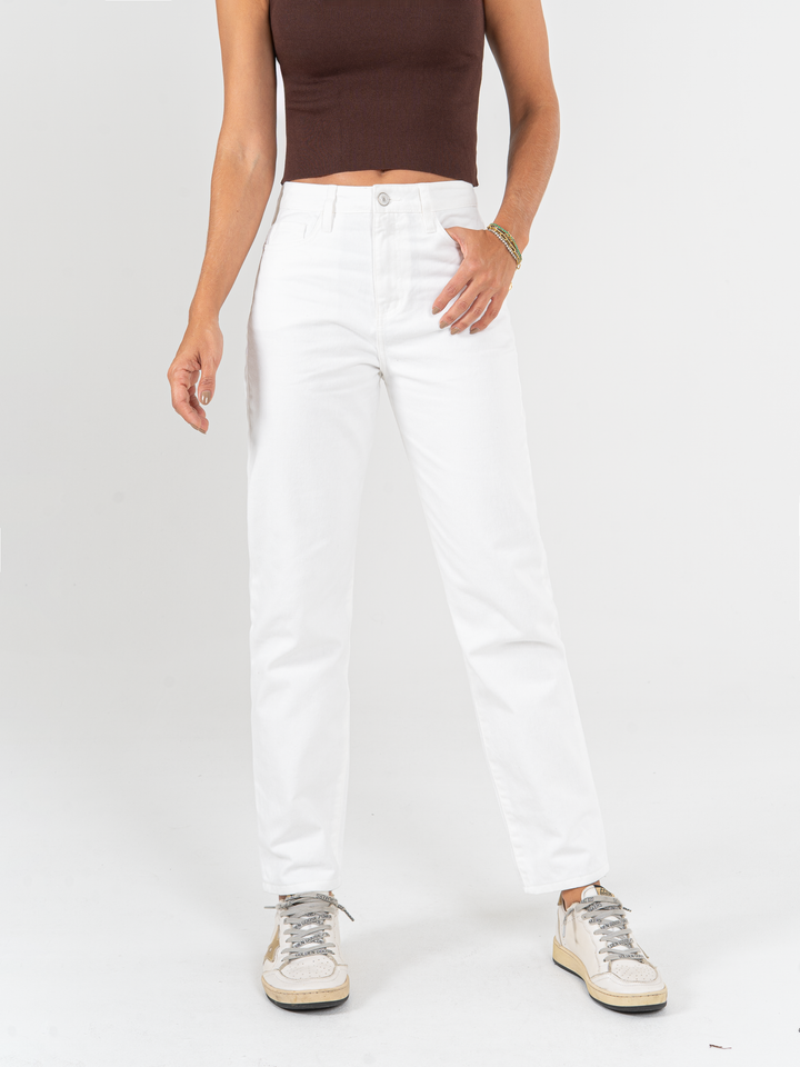 Pantalón mom fit, rígido, tiro alto, tono ivory, cintura ajustada, pierna holgada, diseño cinco bolsillos.