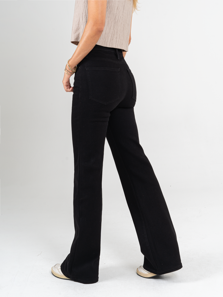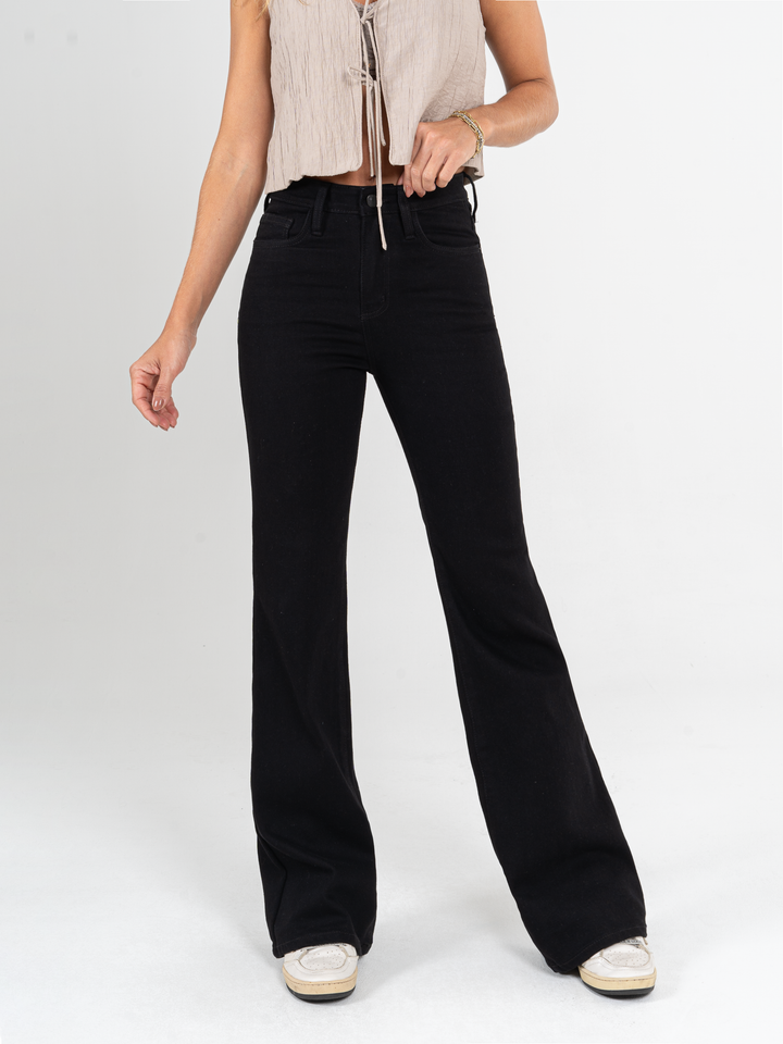 Pantalón flare stretch, bota ancha, tiro alto, tono negro, diseño cinco bolsillos.