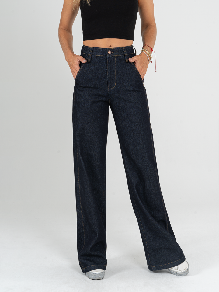 Ref: 064930 Jean Mom Flare, rígido, cortes en pierna, tiro alto, tono azul oscuro.