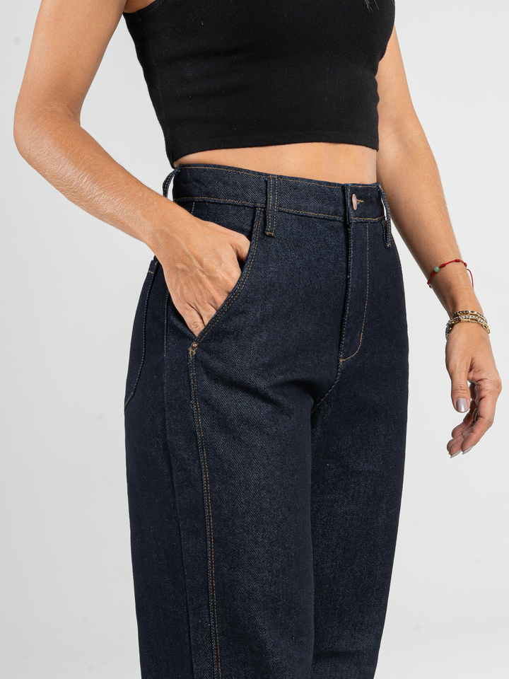 Jean Mom Flare, rígido, cortes en pierna, tiro alto, tono azul oscuro, cintura ajustada y pierna holgada.