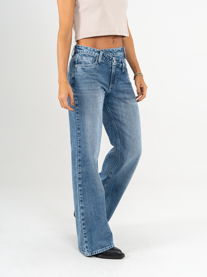 Ref: 065557 Jean Mom Flare, rígido, tiro alto, tono azul medio, detalle en pretina.
