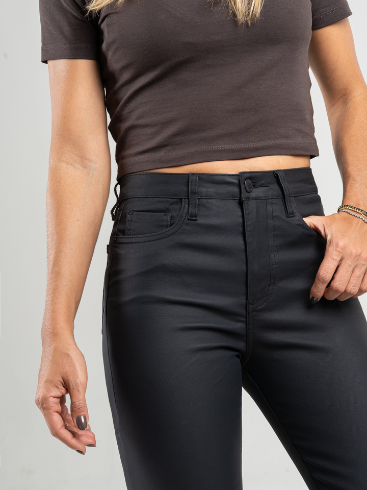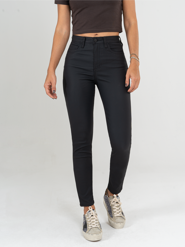 Pantalon Skinny, stretch, tiro alto, tono negro, efecto cuero, cintura ajustada, diseño 5 bolsillos.