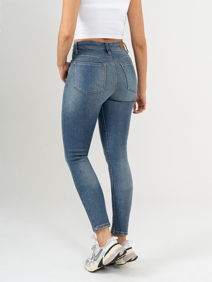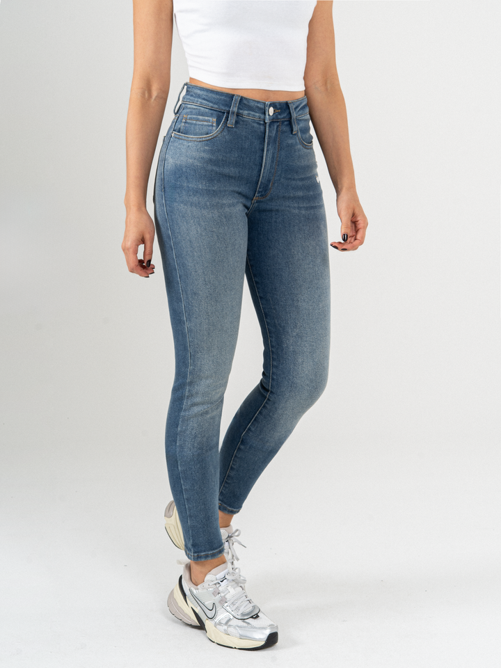 Jean Skinny stretch, tiro alto, tono azul medio, cintura ajustada y diseño cinco bolsillos.