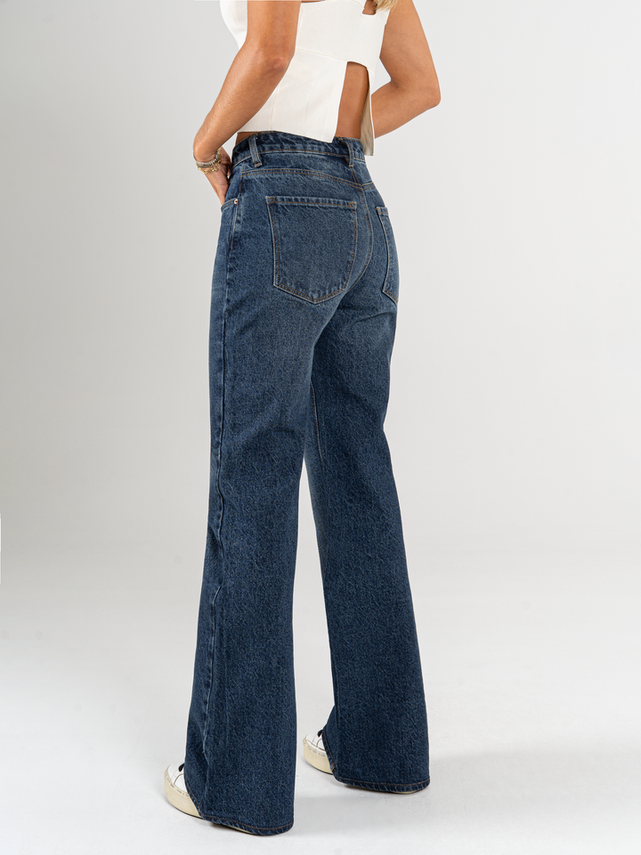 Jean mom Flare, rígido, tiro alto, tono azul oscuro, diseño cinco bolsillos, cintura ajustada y pierna holgada.
