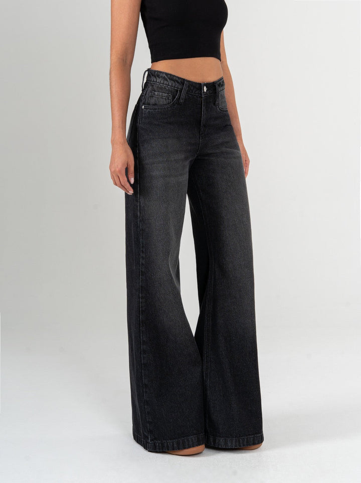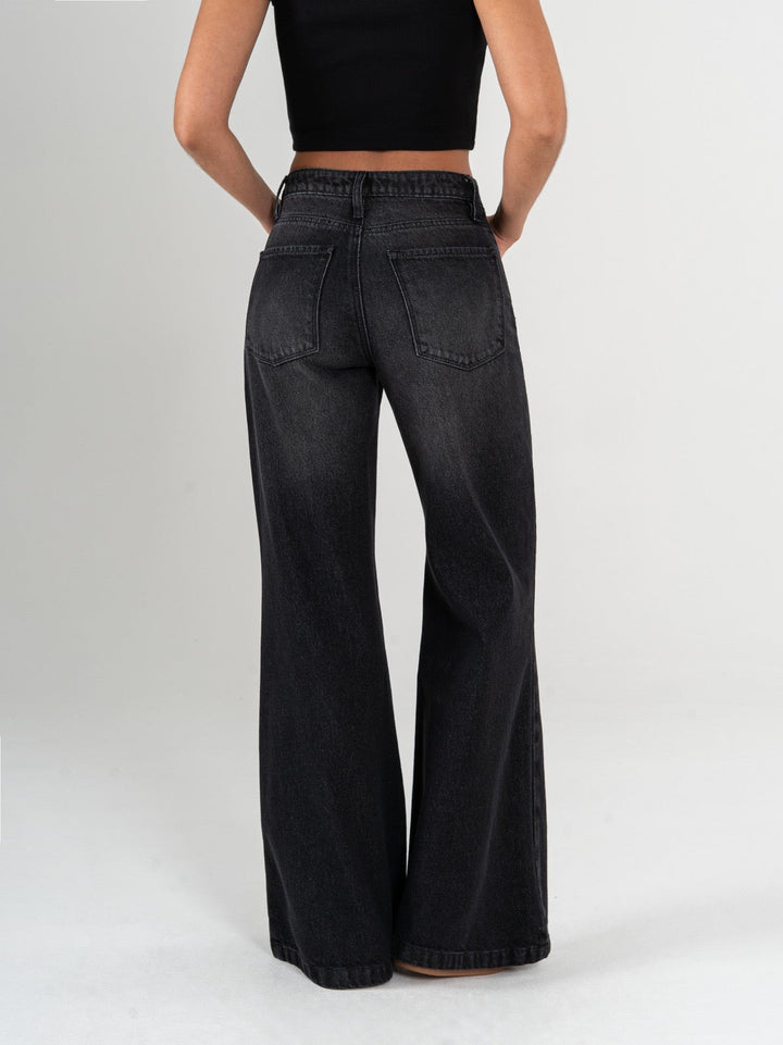 Jean palazzo, rígido, tiro medio, tono gris oscuro, cintura ajustada pierna holgada, diseño cinco bolsillos.