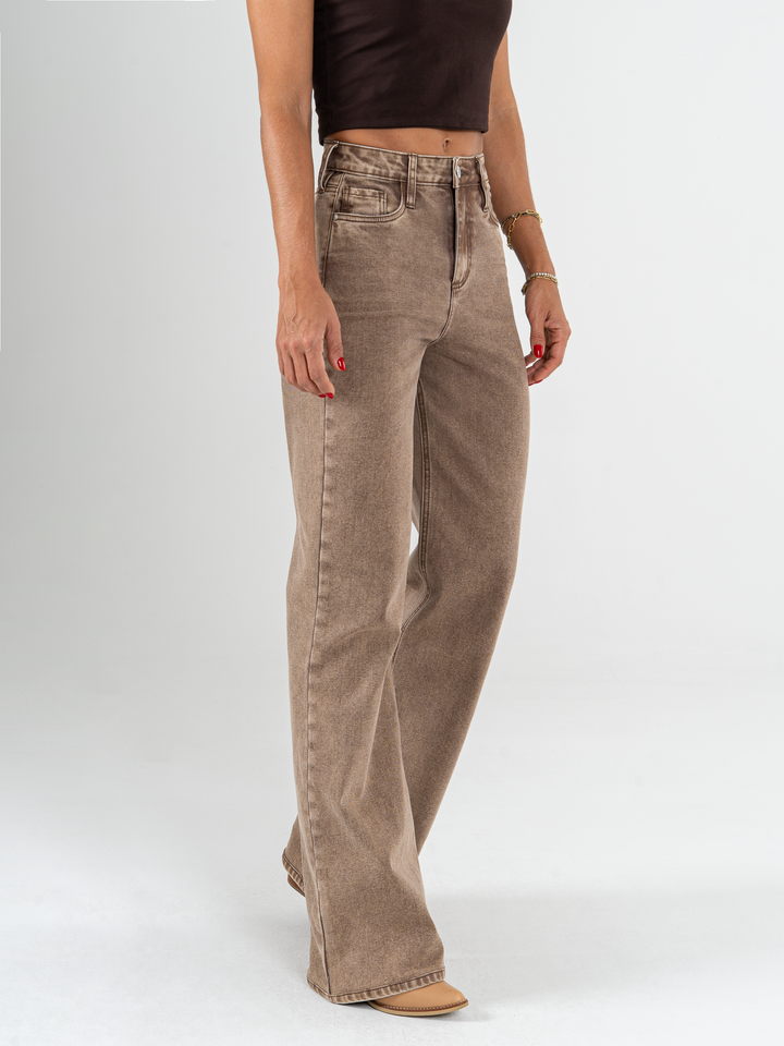 Ref: 065809 Pantalón flare stretch, bota ancha, tiro alto, tono café, silueta ajustada