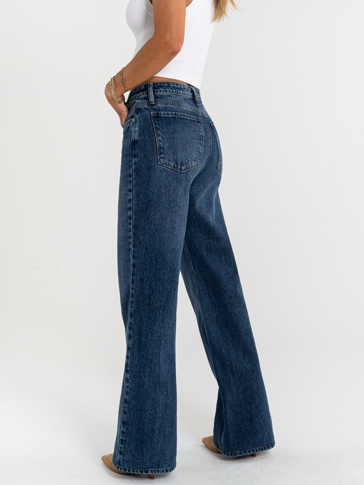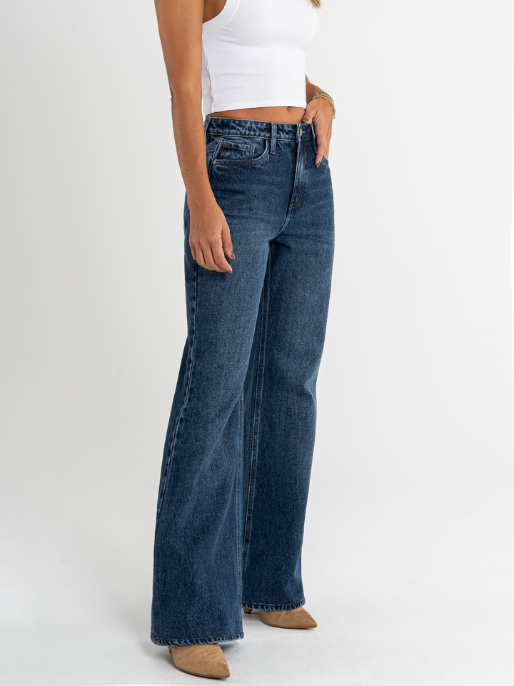 Jean Mom Flare, rígido, tiro alto, tono azul oscuro, diseño cinco bolsillos, cintura ajustada, pierna holgada.