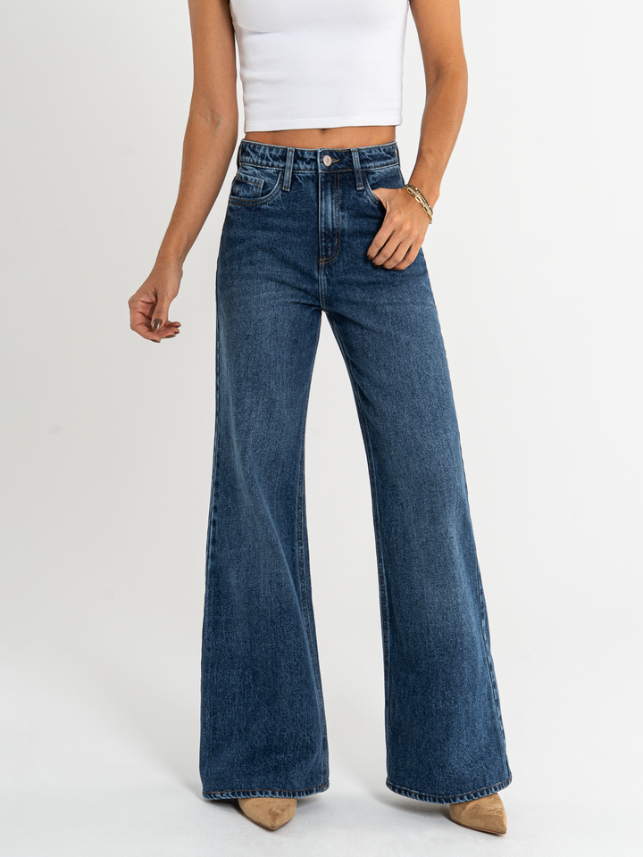 Ref: 065830 Jean Mom Flare, rígido, tiro alto, tono azul oscuro.