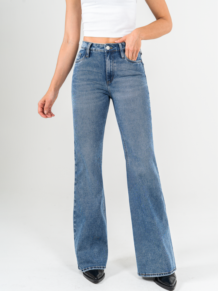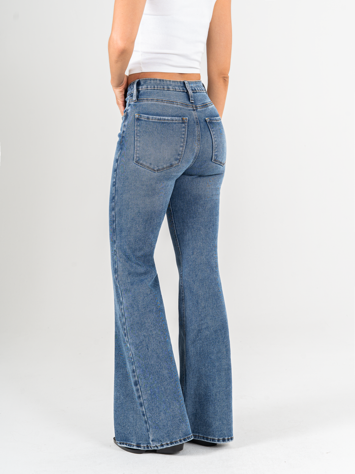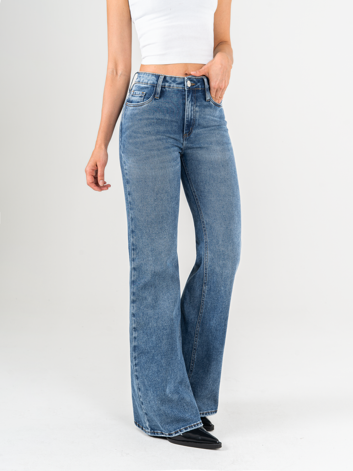Jean flare stretch, bota ancha, tiro alto, tono azul medio, silueta ajustada, diseño cinco bolsillos.