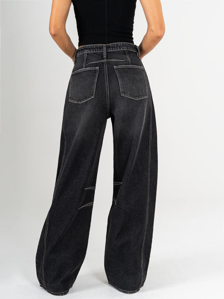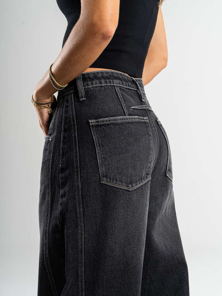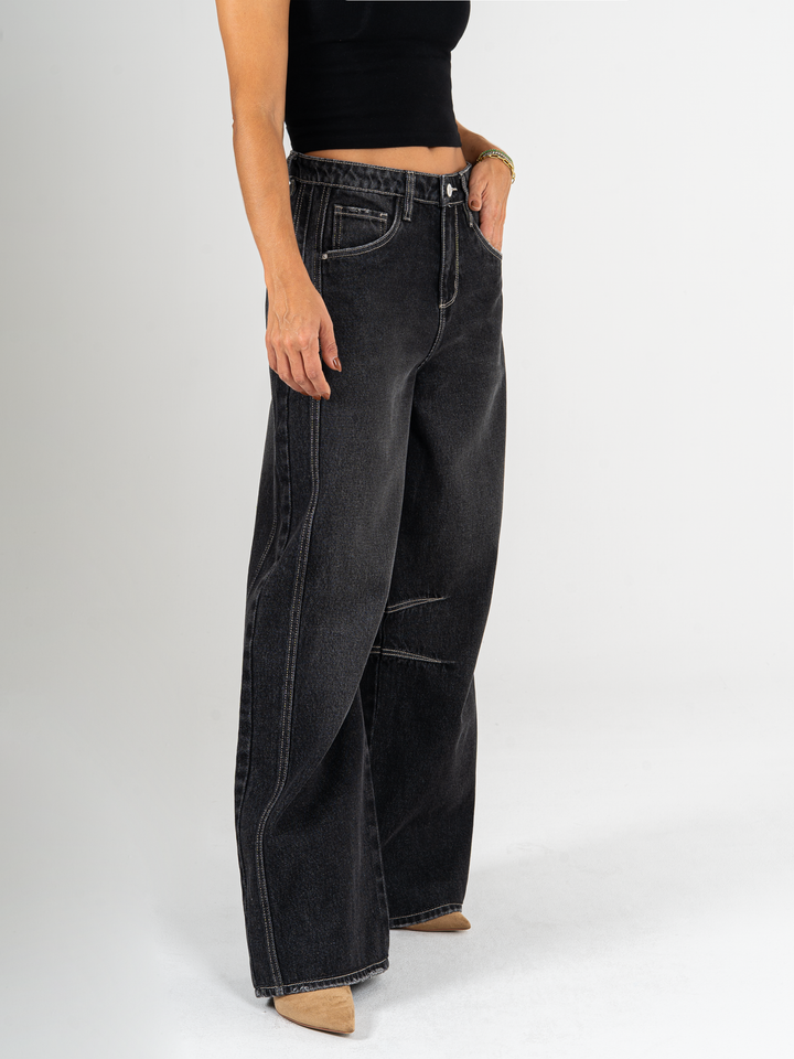 Jean wide leg, tiro alto, con cortes, rígido, tono gris oscuro, diseño 5 bolsillos, cintura ajustada y silueta amplia de pierna recta.