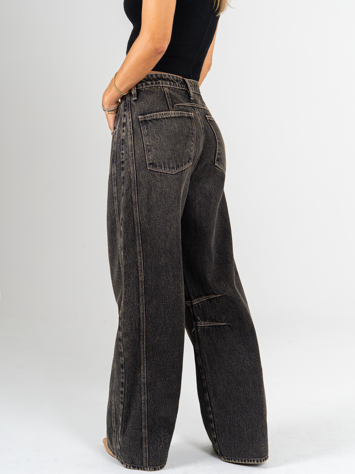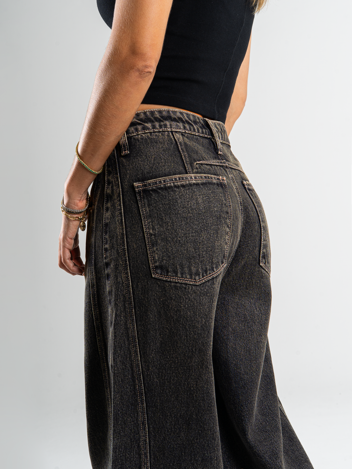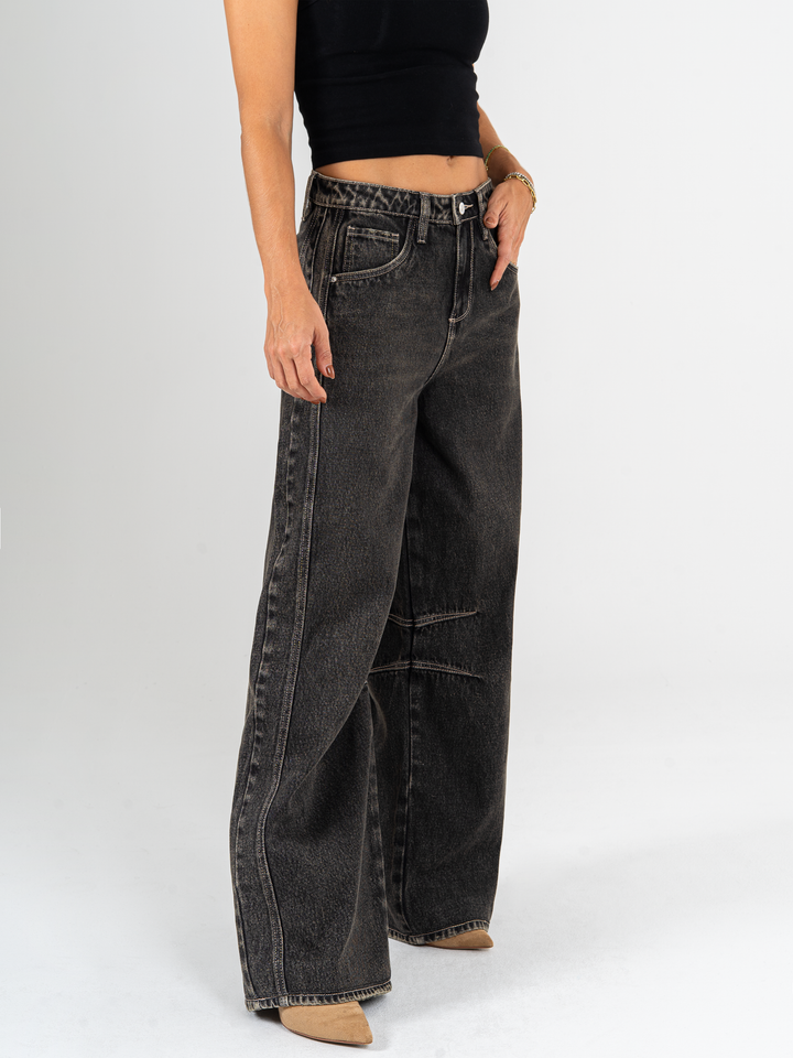 Jean wide leg, tiro alto, con cortes, rígido, tono gris medio, diseño 5 bolsillos, cintura ajustada y silueta amplia de pierna recta.