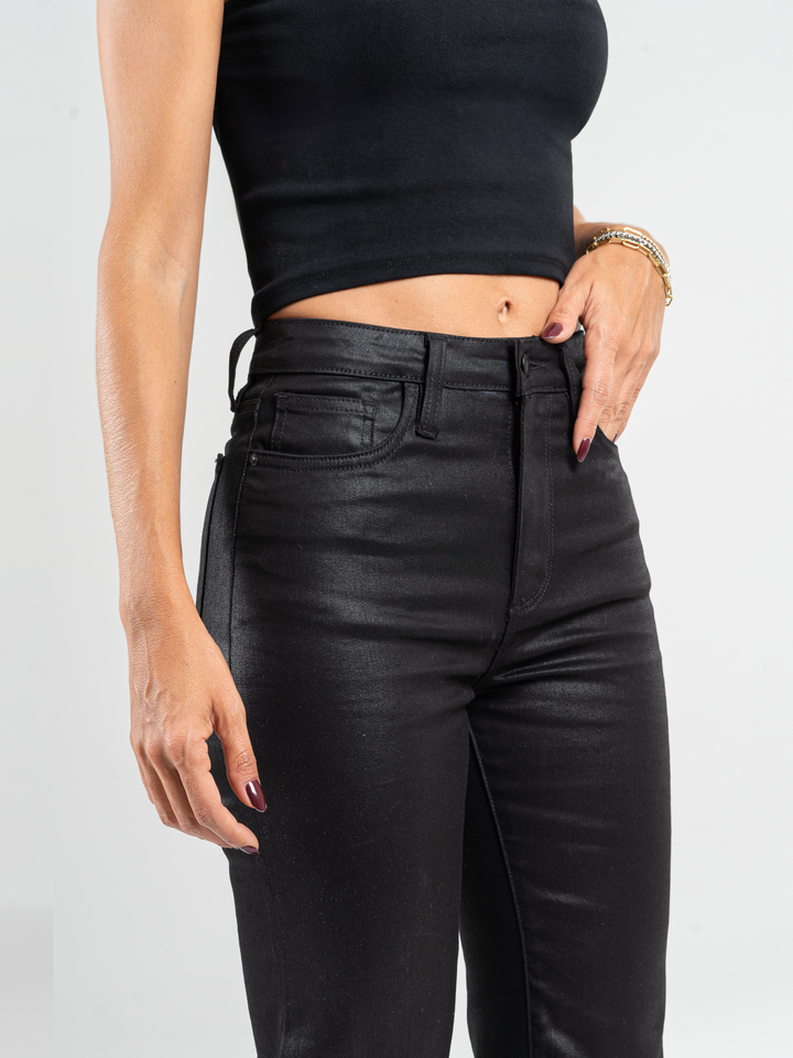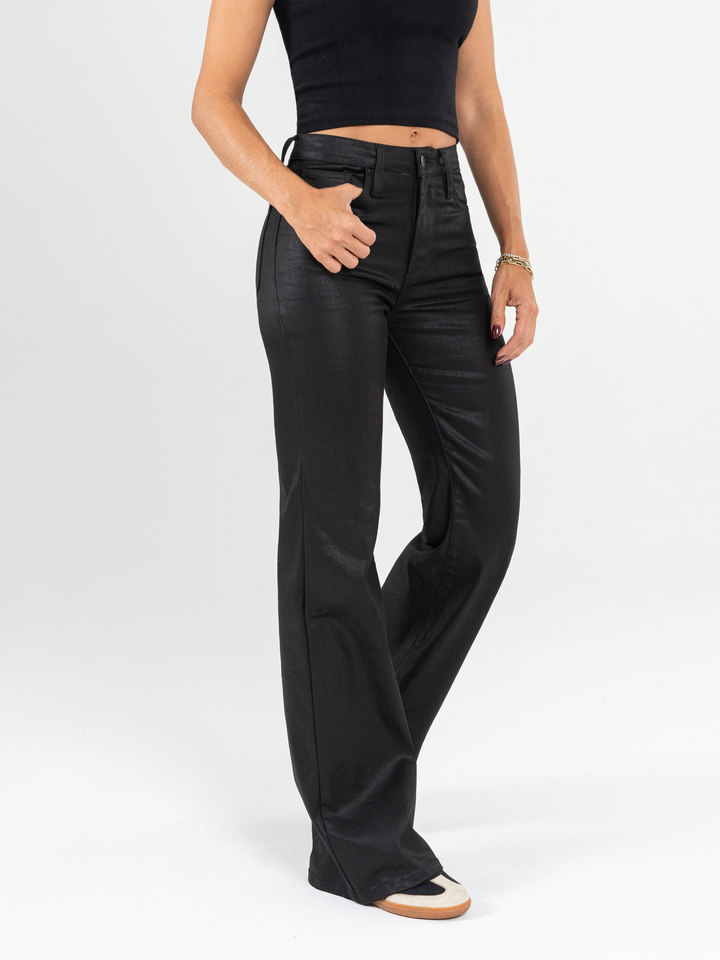 Pantalón flare stretch, bota ancha, tiro alto, tono negro, efecto encerado, diseño cinco bolsillos.