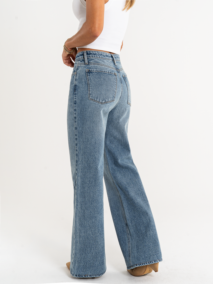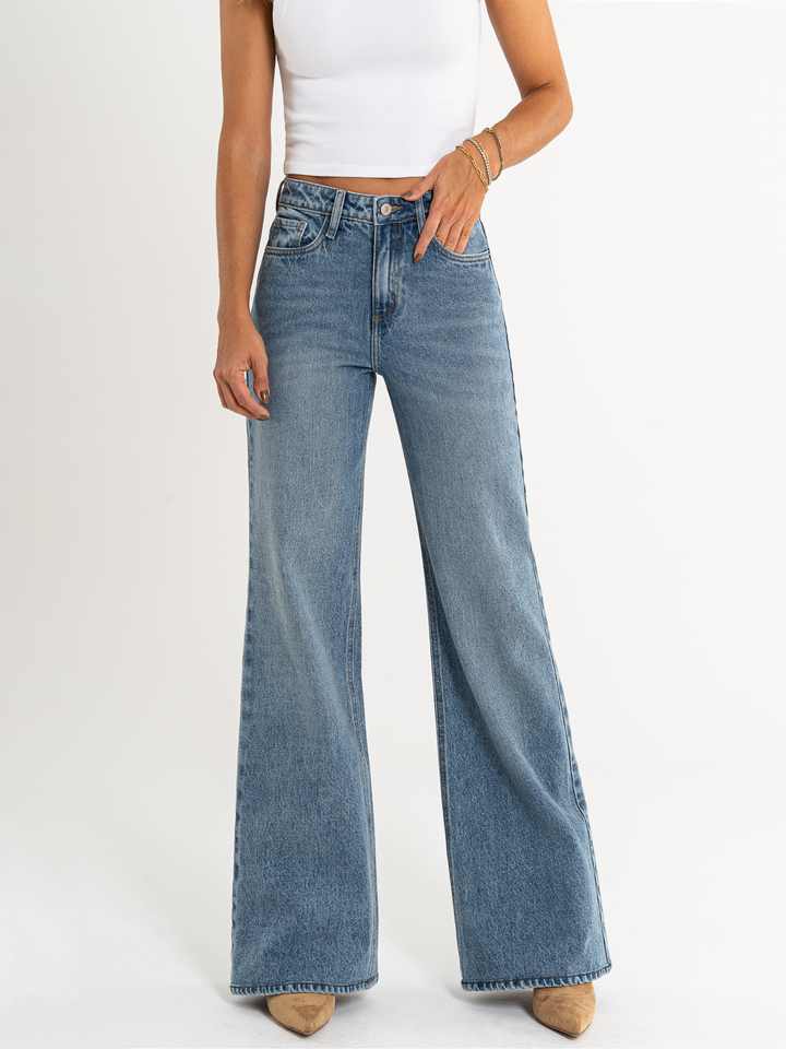 Ref: 065906 Jean Mom Flare, rígido, tiro alto, tono azul medio.