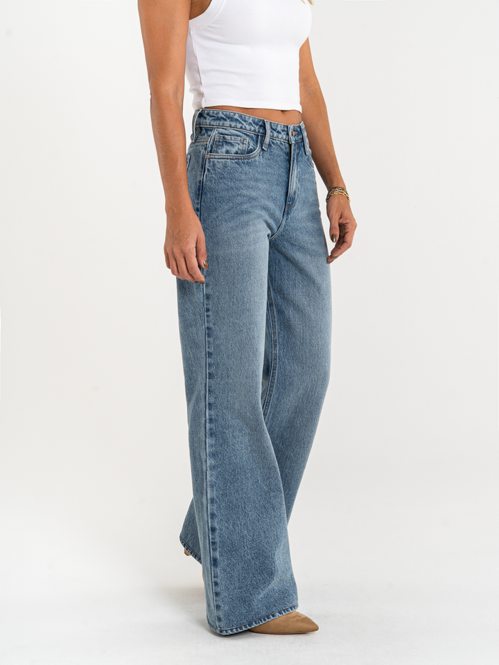 Jean Mom Flare, rígido, tiro alto, tono azul medio, diseño cinco bolsillos, cintura ajustada, pierna holgada.