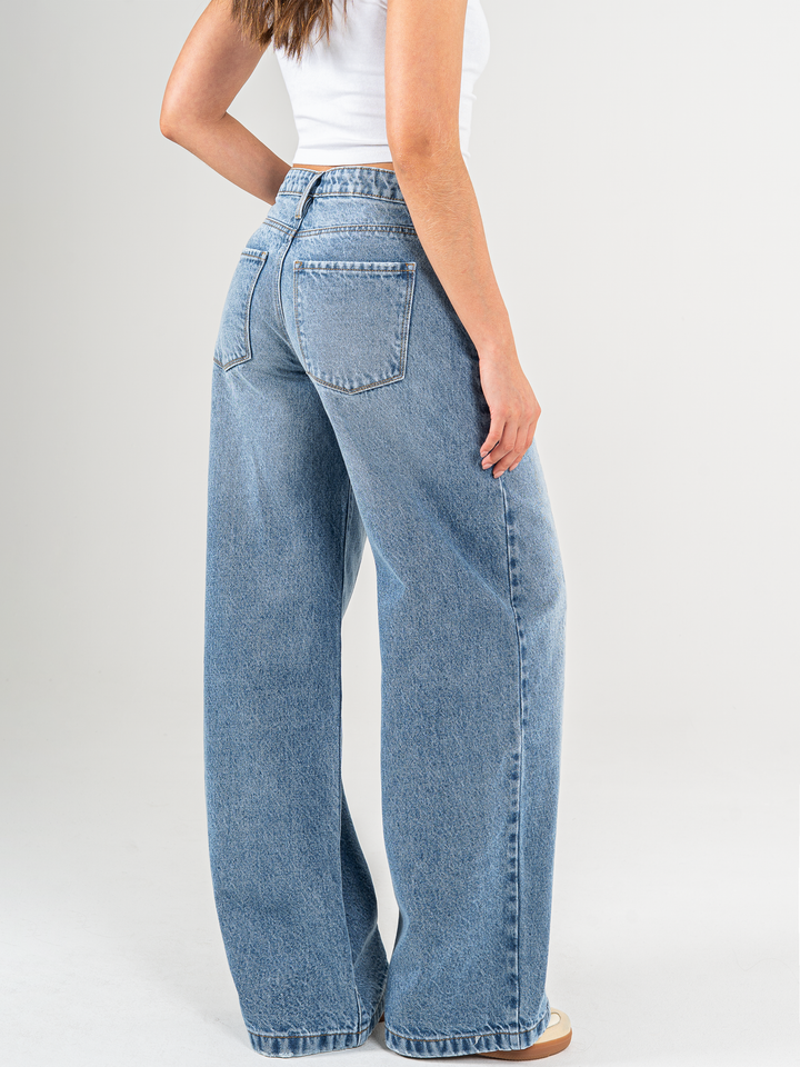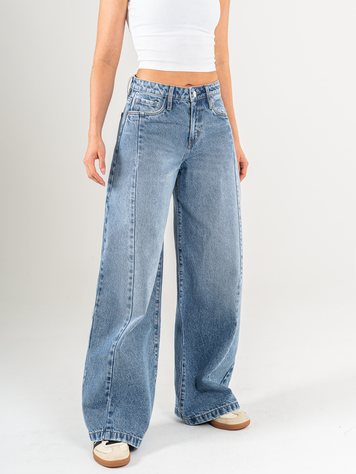Jean wide leg, tiro medio, con cortes, rígido, tono azul medio, diseño 5 bolsillos, cintura ajustada y silueta amplia de pierna recta.