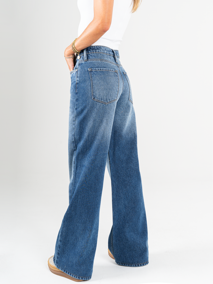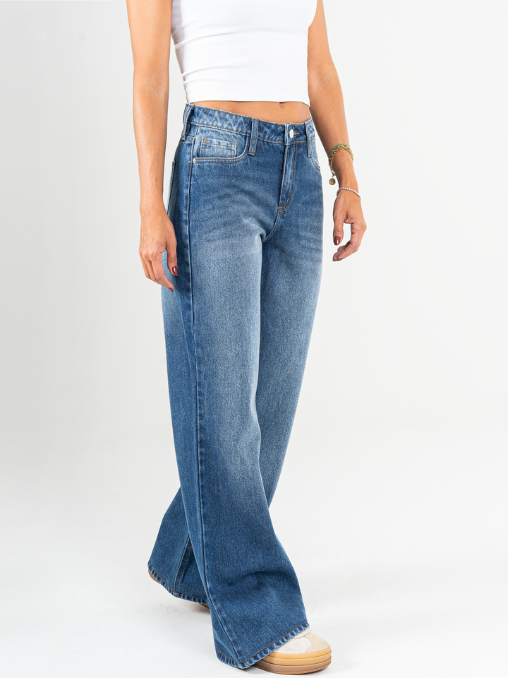 Jean mom Flare, rígido, tiro medio, tono azul medio, diseño cinco bolsillos, cintura ajustada y pierna holgada.