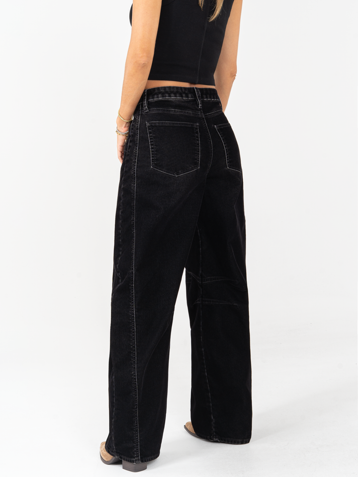 Jean wide leg, confort, denim acabado terciopelo, tono negro, tiro alto, diseño cinco bolsillos.