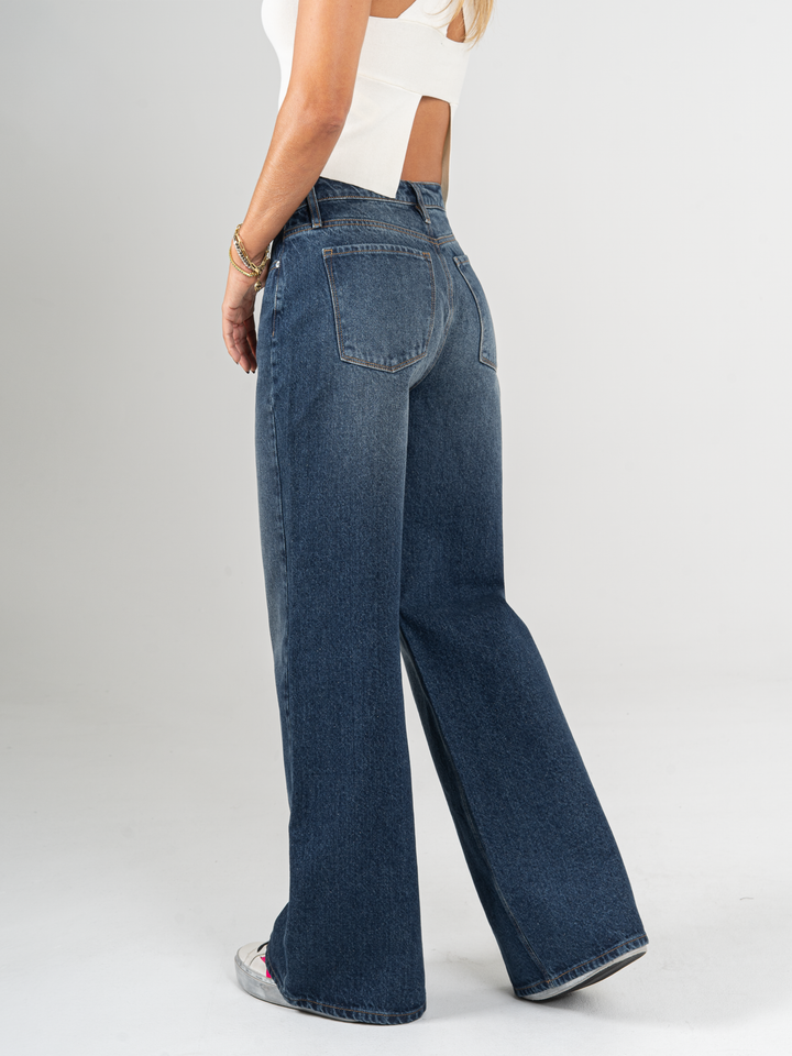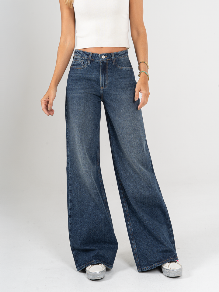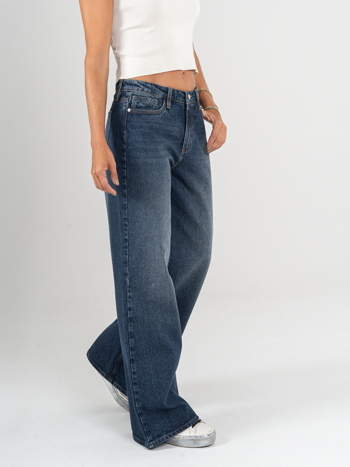 Jean palazzo, rígido, tiro alto, tono azul oscuro, diseño 5 bolsillos, cintura ajustada y pierna holgada.