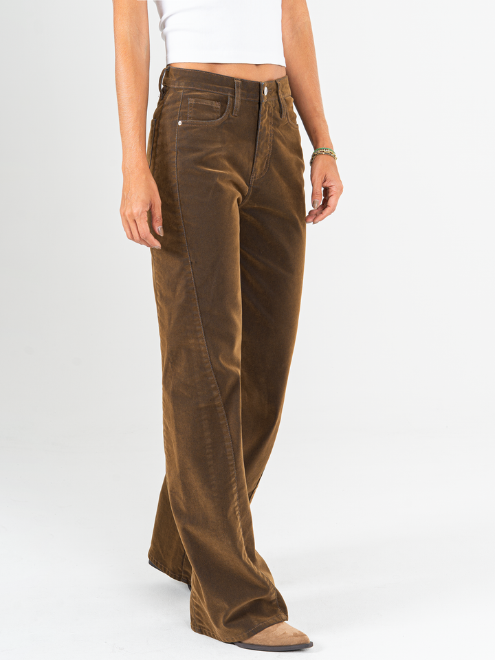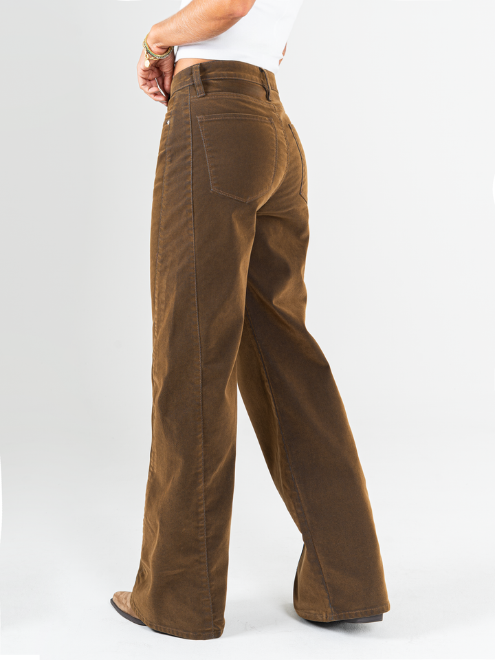 Ref: 065985 Jean mom flare, confort, denim velvet, acabado terciopelo, tiro alto, tono cafe.