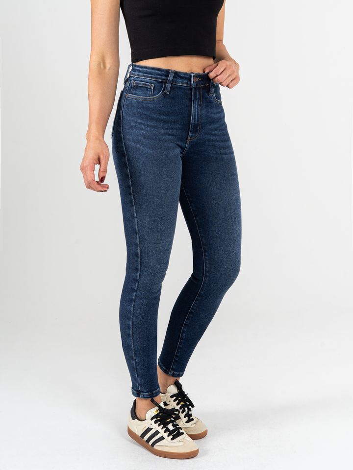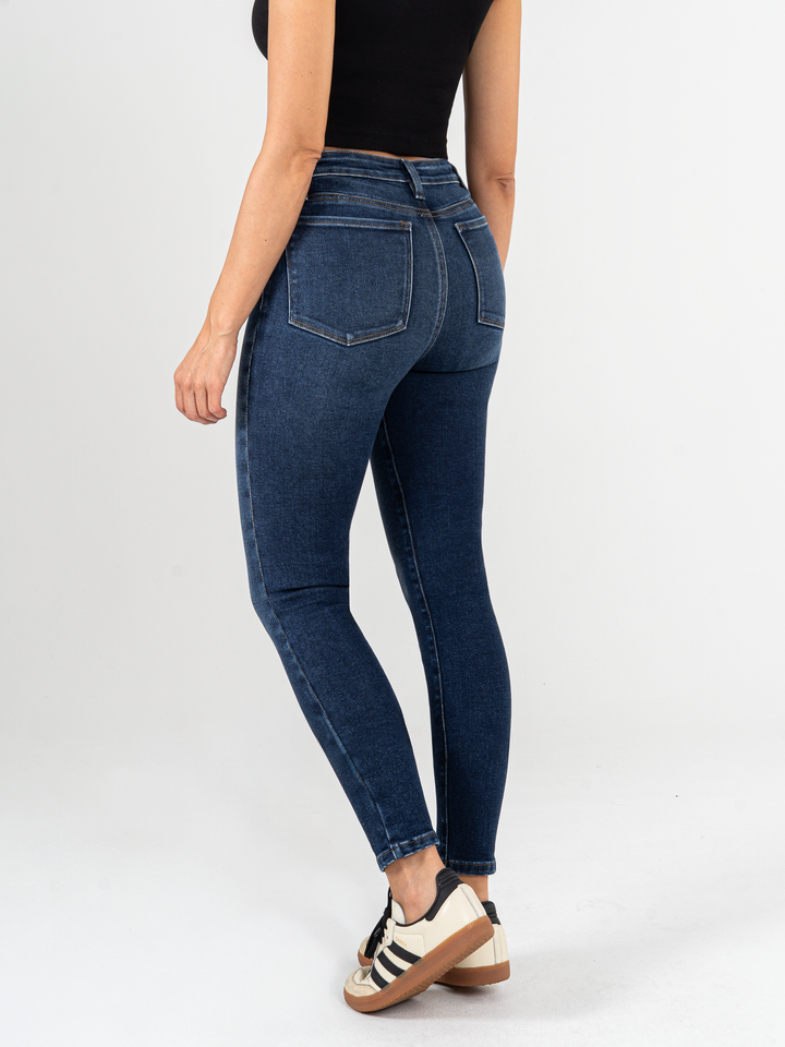 Jean Skinny stretch, tiro alto, tono azul oscuro, cintura ajustada y diseño cinco bolsillos.