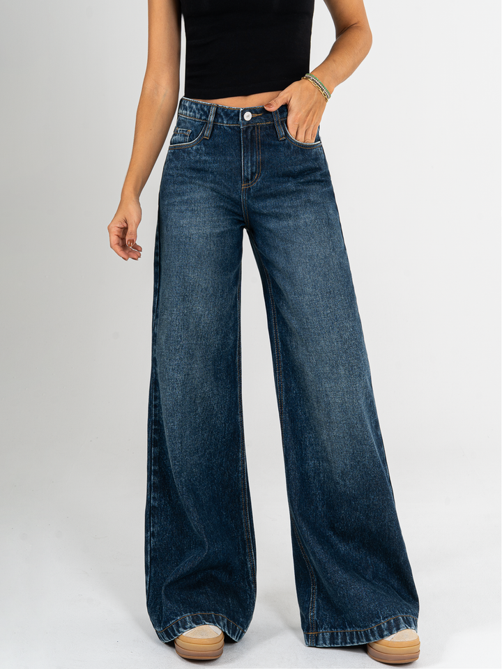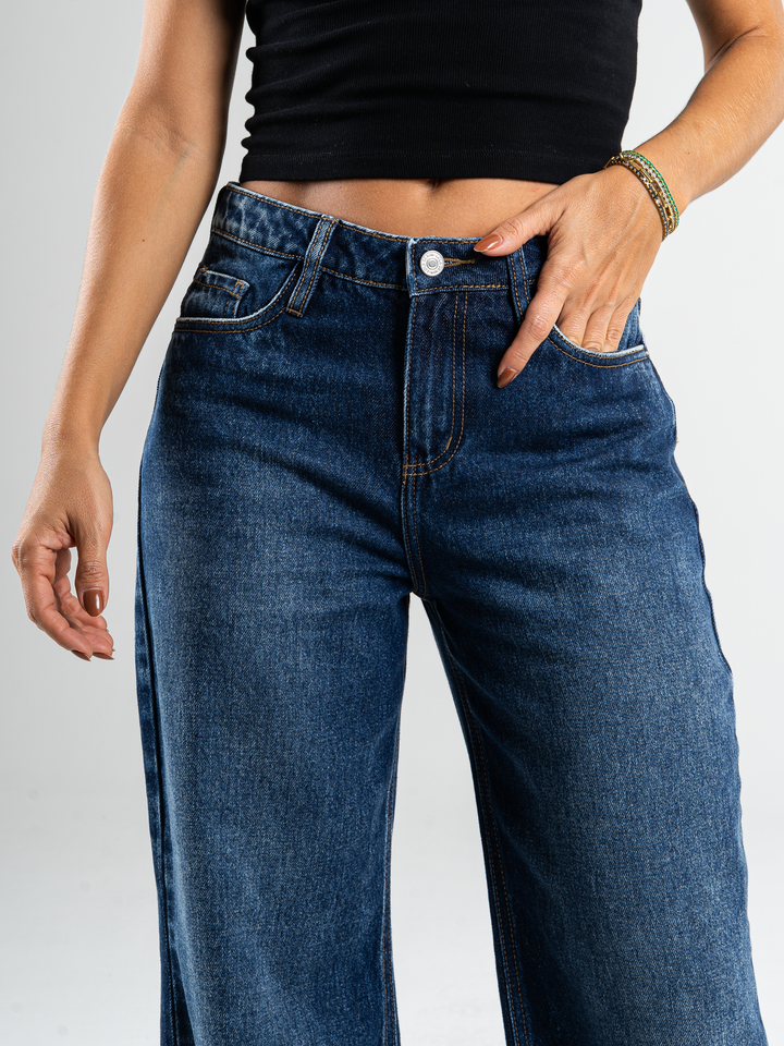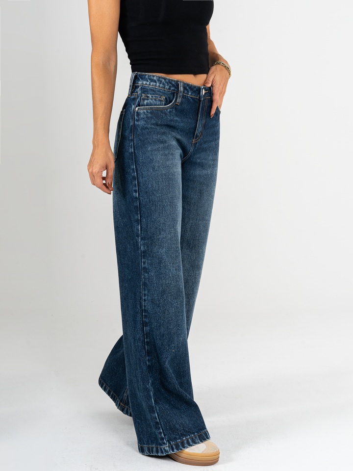 Jean palazzo, rígido, tiro medio, tono azul oscuro, cintura ajustada pierna holgada, diseño cinco bolsillos.
