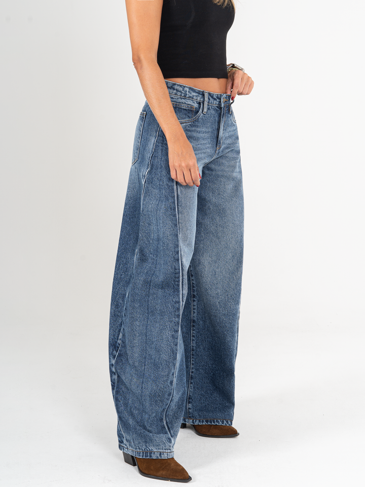 Ref: 065999 Jean wide leg, tiro medio, corte en costado, detalle de tela con lavado combinado,rígido, tono azul oscuro