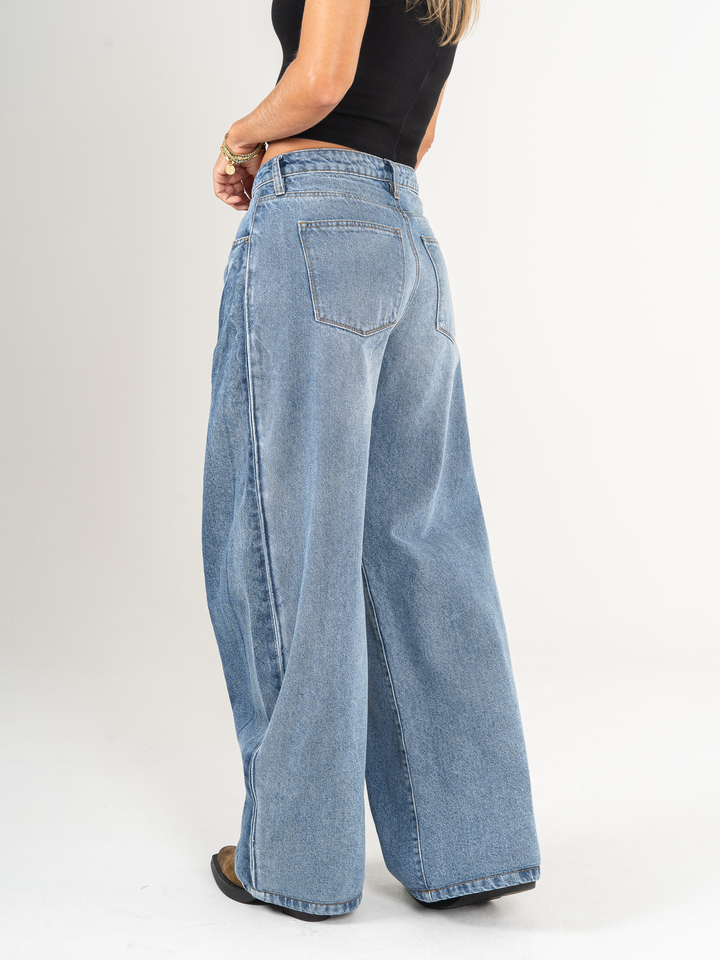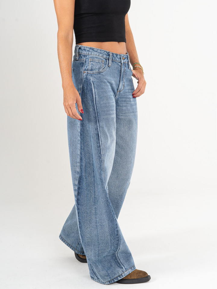 Ref: 066000 Jean wide leg, tiro medio, corte en costado, detalle de tela con lavado combinado, rígido, tono azul medio