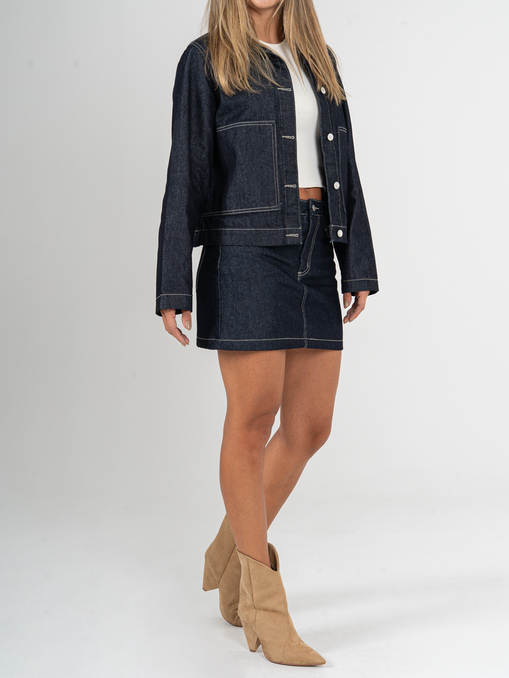 Chaqueta en denim rígido, bolsillos delanteros, tono azul oscuro.