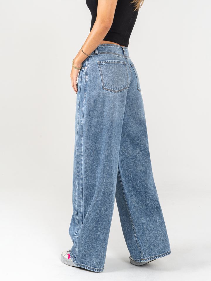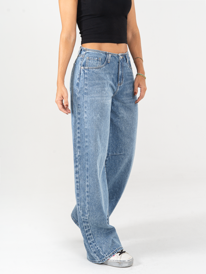 Jean wide leg, tiro medio, detalle en pretina, rígido, tono azul medio, diseño 5 bolsillos, cintura ajustada y silueta amplia de pierna recta.