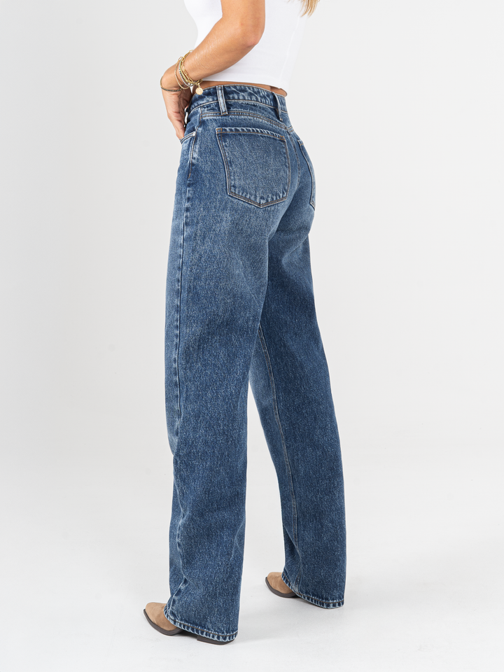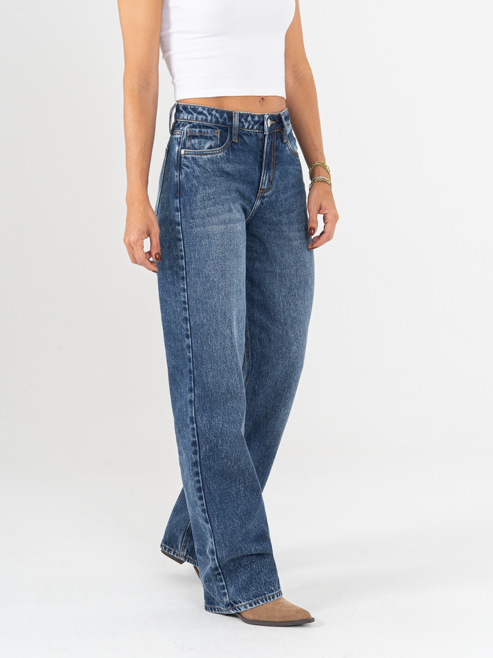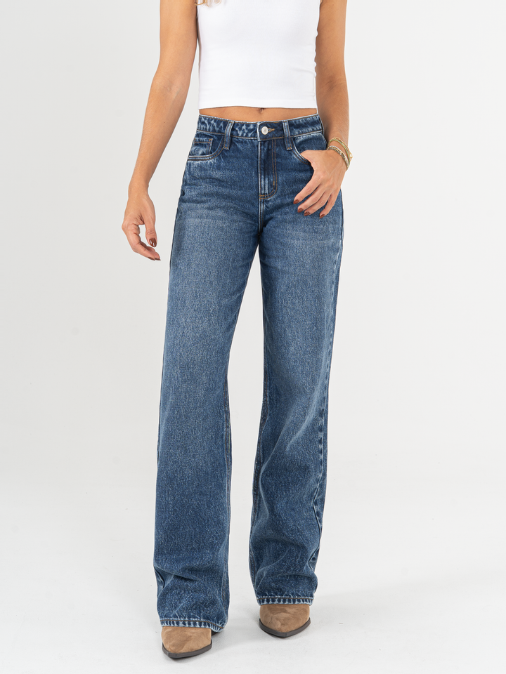 Jean straight leg, rígido, tiro medio, tono azul oscuro, diseño cinco bolsillos, cintura ajustada, pierna recta.