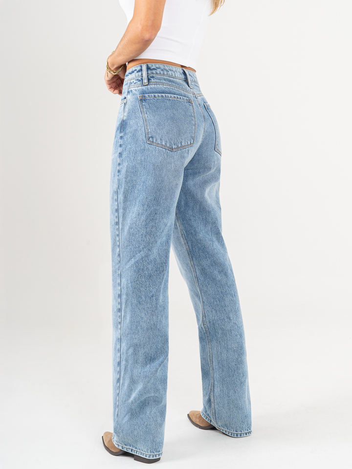 Jean straight leg, rígido, tiro medio, tono azul medio, diseño cinco bolsillos, cintura ajustada, pierna recta.
