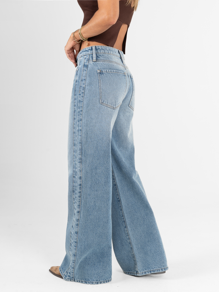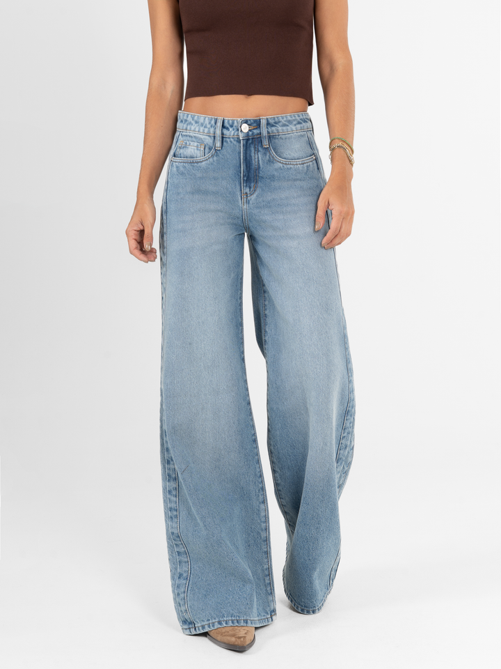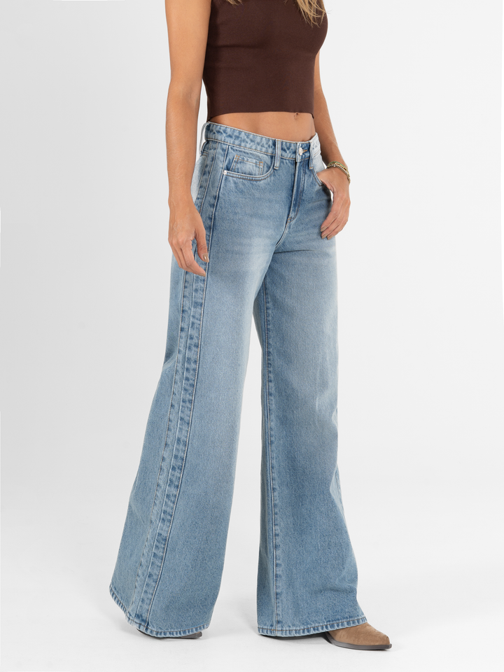 Jean palazzo, rígido, tiro medio, corte en costado, tono azul medio, cintura ajustada pierna holgada, diseño cinco bolsillos.