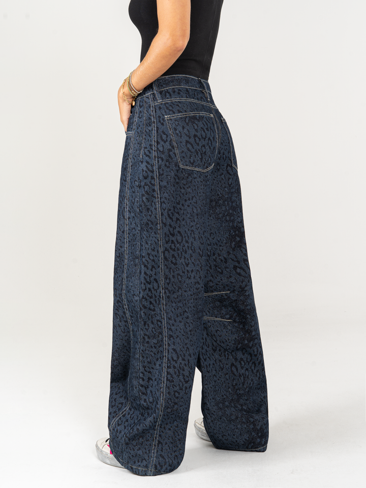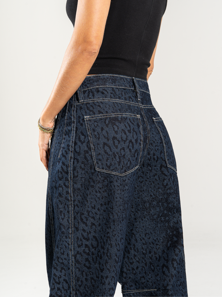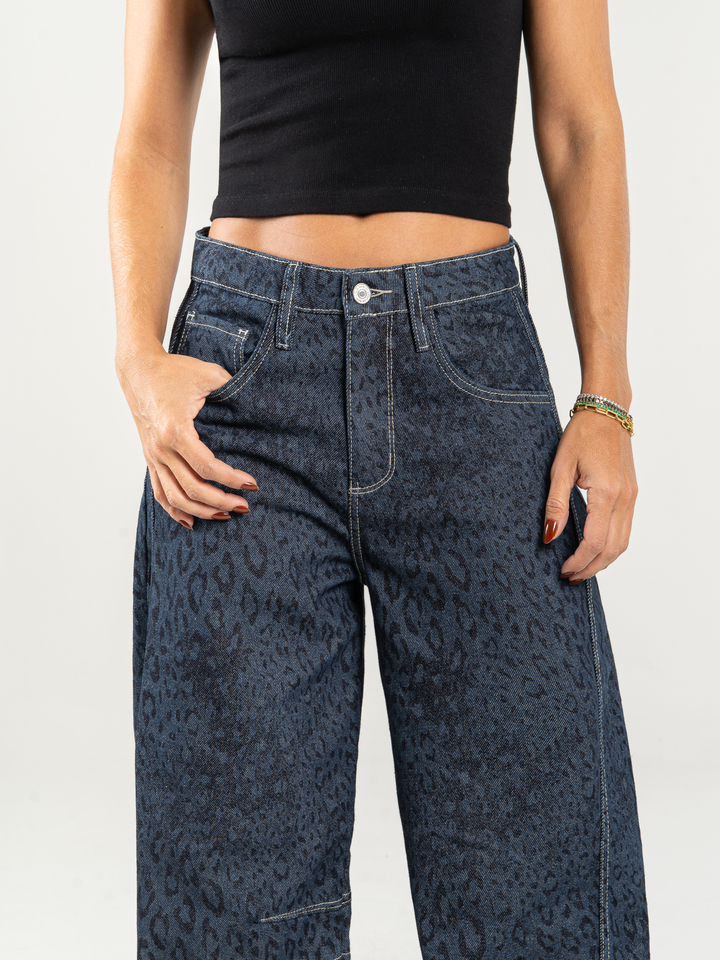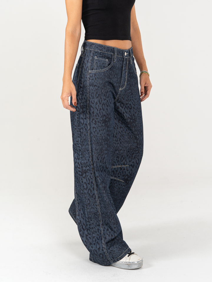 Jean wide leg, animal print, tiro alto, con cortes, rígido, tono azul oscuro, diseño 5 bolsillos, cintura ajustada y silueta amplia de pierna recta.