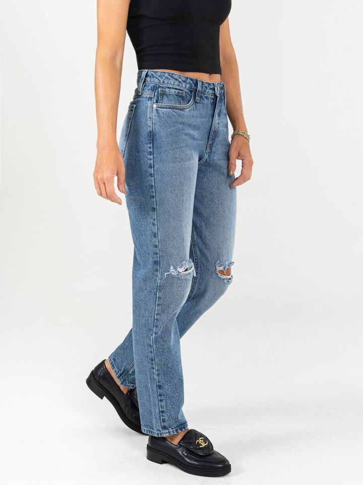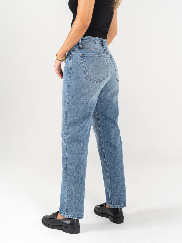 Jean Mom fit, rígido, tiro alto, tono azul medio con rotos, cintura ajustada pierna holgada, diseño cinco bolsillos.