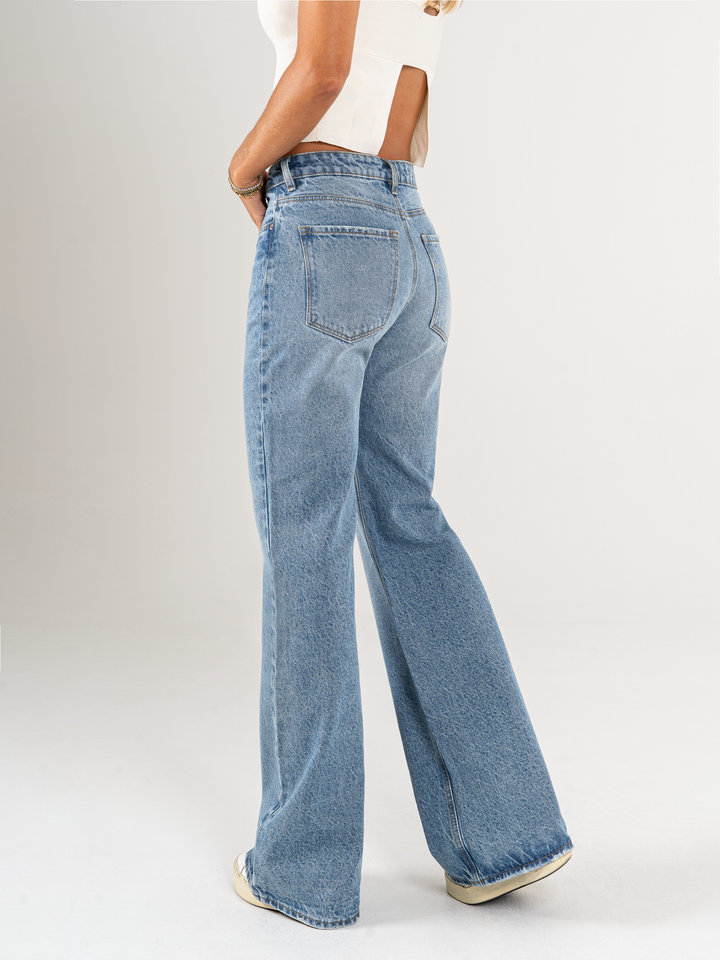 Jean mom Flare, rígido, tiro alto, tono azul medio, diseño cinco bolsillos, cintura ajustada y pierna holgada.