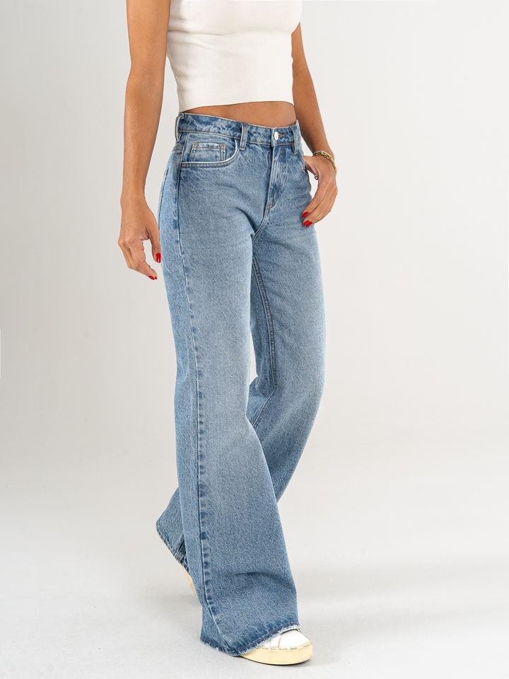 Ref: 066095 Jean mom Flare, rígido, tiro alto, tono azul medio