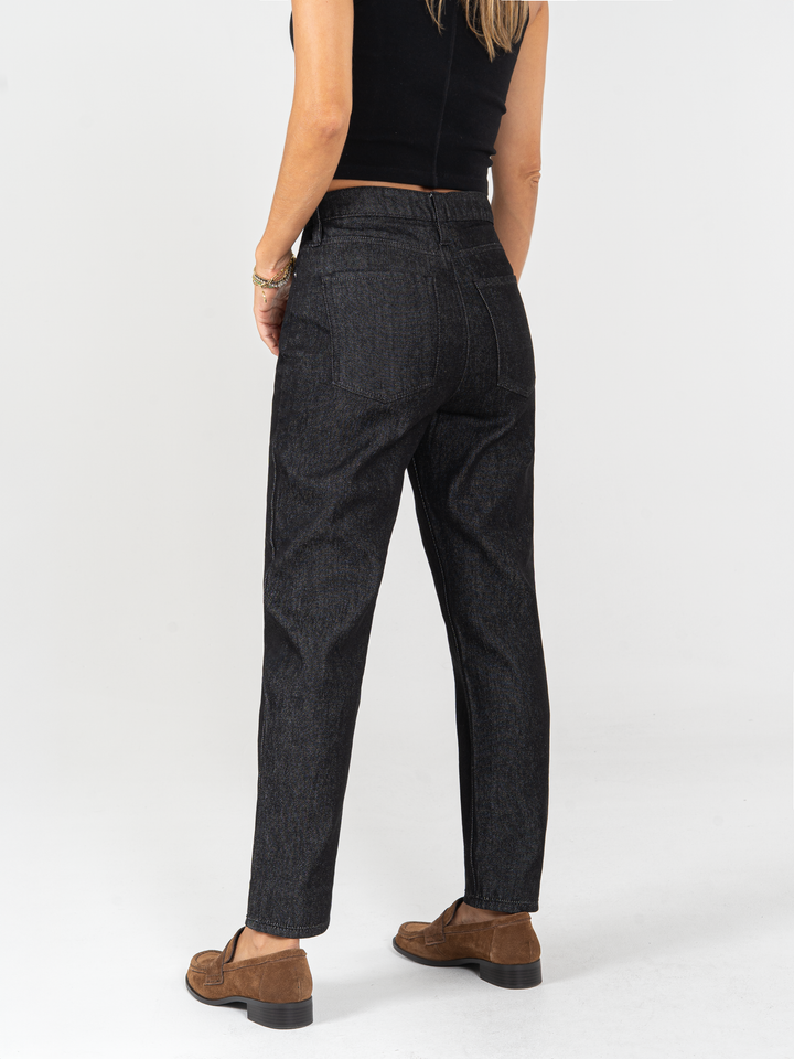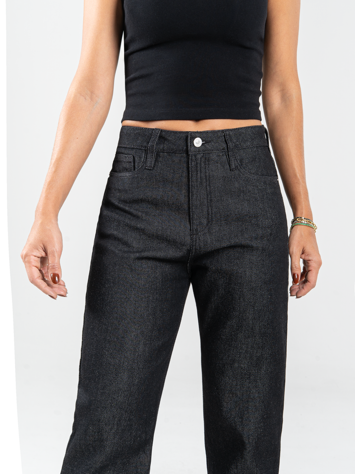 Jean Mom fit, rígido, tiro alto, tono gris oscuro, cintura ajustada pierna holgada, diseño cinco bolsillos.