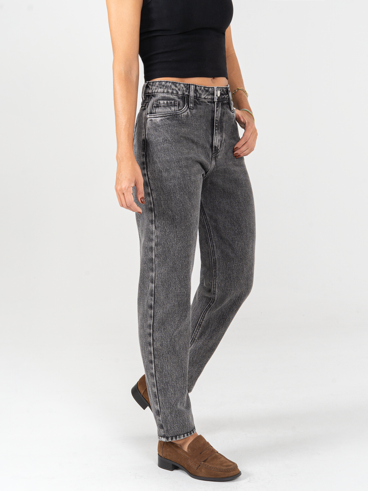 Jean Mom fit, rígido, tiro alto, tono gris medio, cintura ajustada pierna holgada, diseño cinco bolsillos.