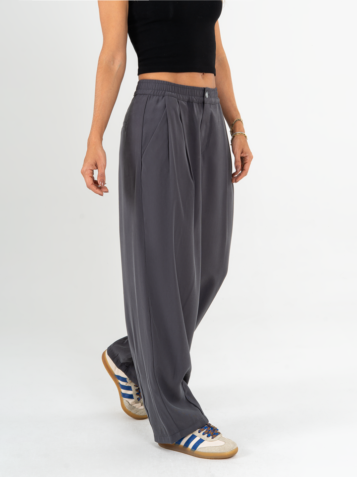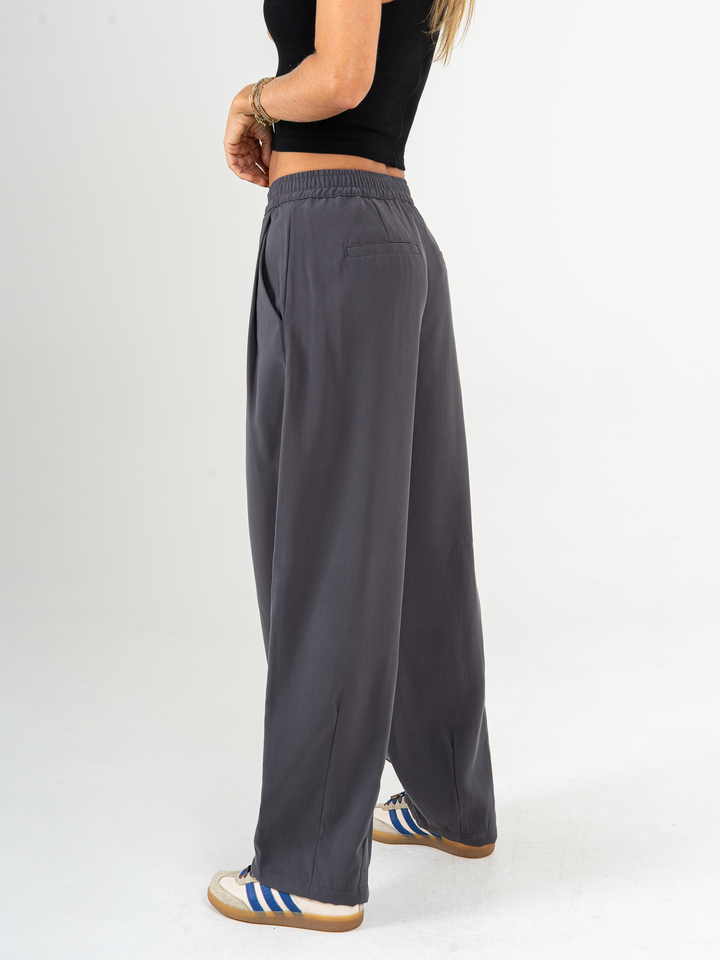 Pantalón wide leg, tejido plano liviano, tiro medio, con prenses, tono gris oscuro, cintura con resorte, bolsillo ribete, silueta amplia