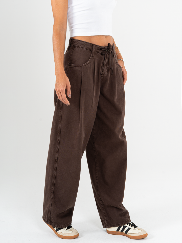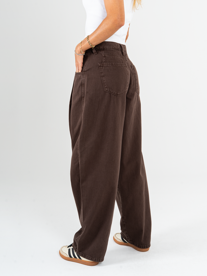 Pantalón wide leg, rígido, tiro medio, tono cafe, diseño cinco bolsillos, silueta amplia