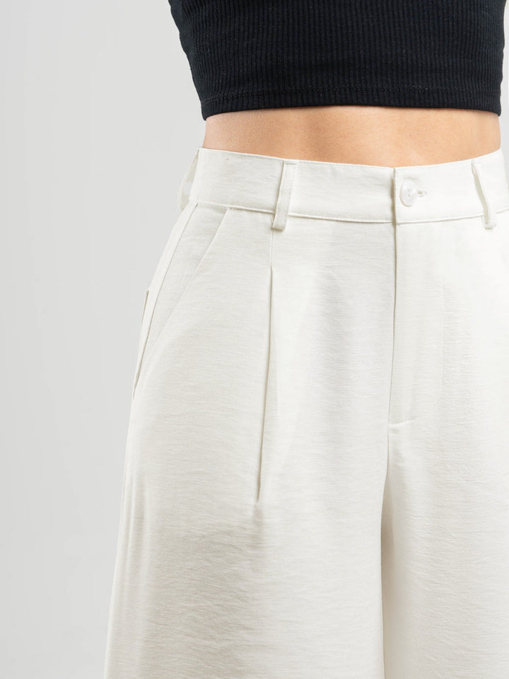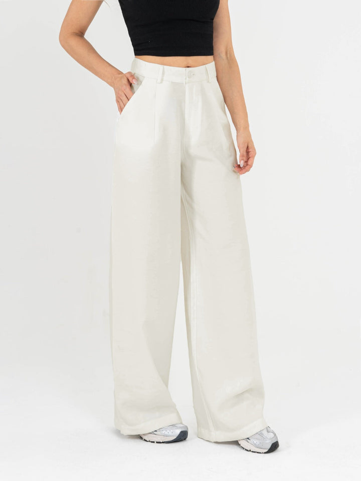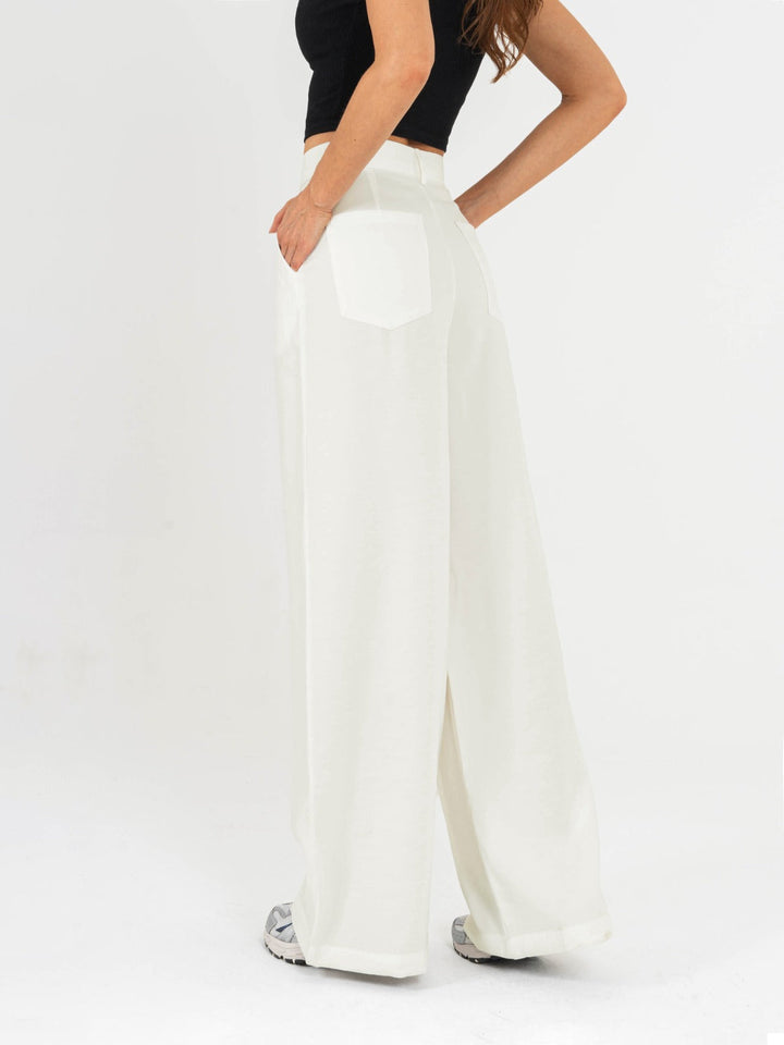 Pantalón palazzo, prenses, tono ivory tejido plano liviano, tiro alto, bolsillo al diagonal, silueta amplia.