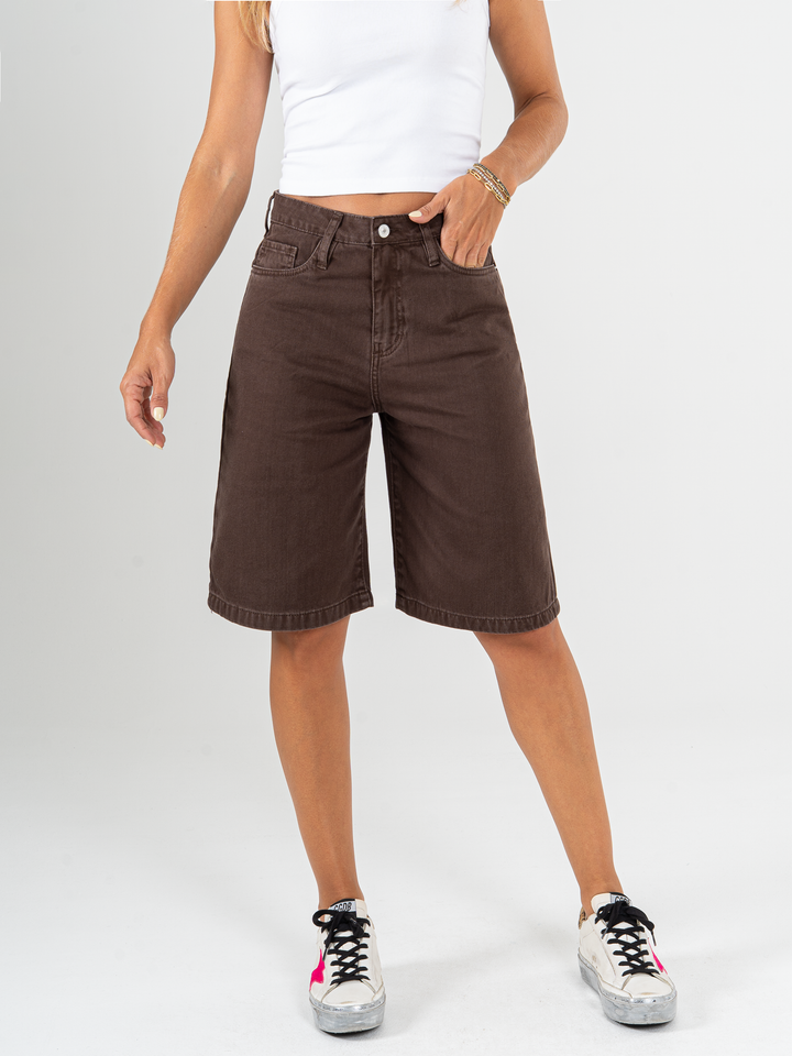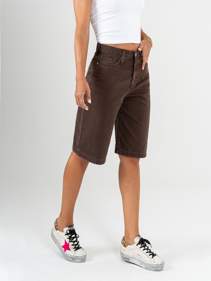 Bermuda dril rígido, tiro alto, tono café, silueta amplia.