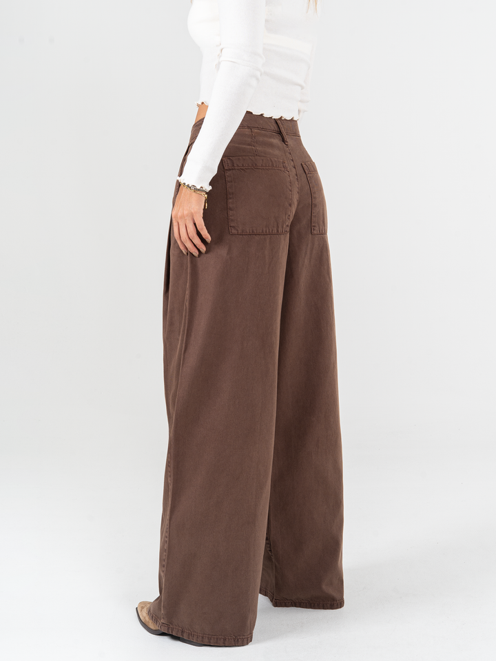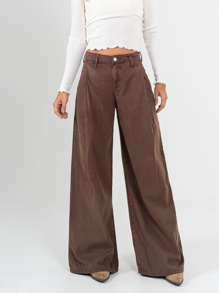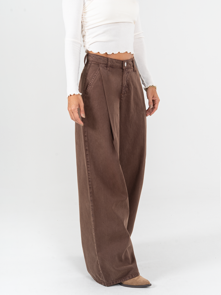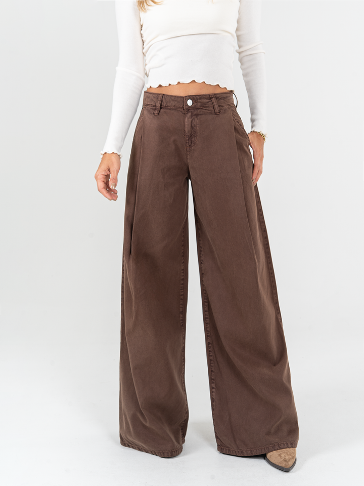 Pantalón palazzo, rígido, prenses, tiro alto, tono café, cintura ajustada pierna holgada, bolsillo diagonal.