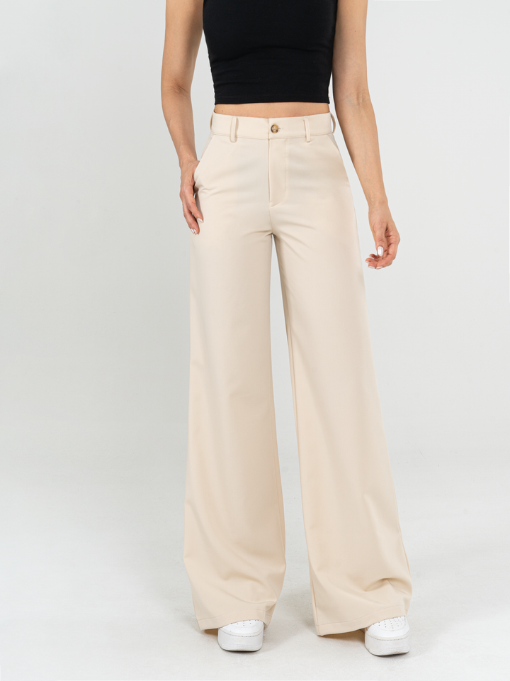Pantalón palazzo, stretch, sin prenses, tejido plano liviano, tono arena, tiro alto, bolsillo diagonal, silueta amplia.