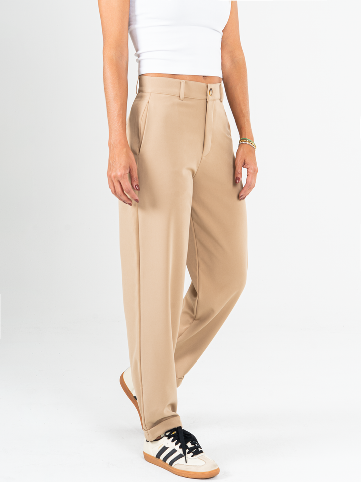 Pantalón slouchy, sin prense, tono caqui, tejido plano liviano, tiro alto, bolsillo, silueta amplia.